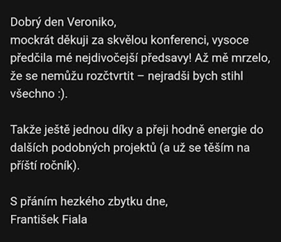 "Ahoj Veru, chtěla jsem ti poděkovat za sdílení tvého pracovního příběhu, vnímám v něm podobnost s mým. Cekala mě v pátek schůzka a pomohlo mi to sebrat dost odvahy odejít z projektu, který sice vypadá perspektivně, ale mne bere sílu a energii. Diky. Iva"